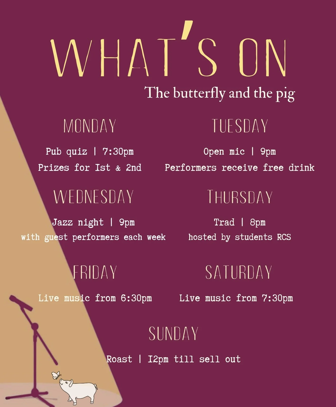 Enjoy entertainment 6 nights a week from quiz nights, open mics, DJs and live music.